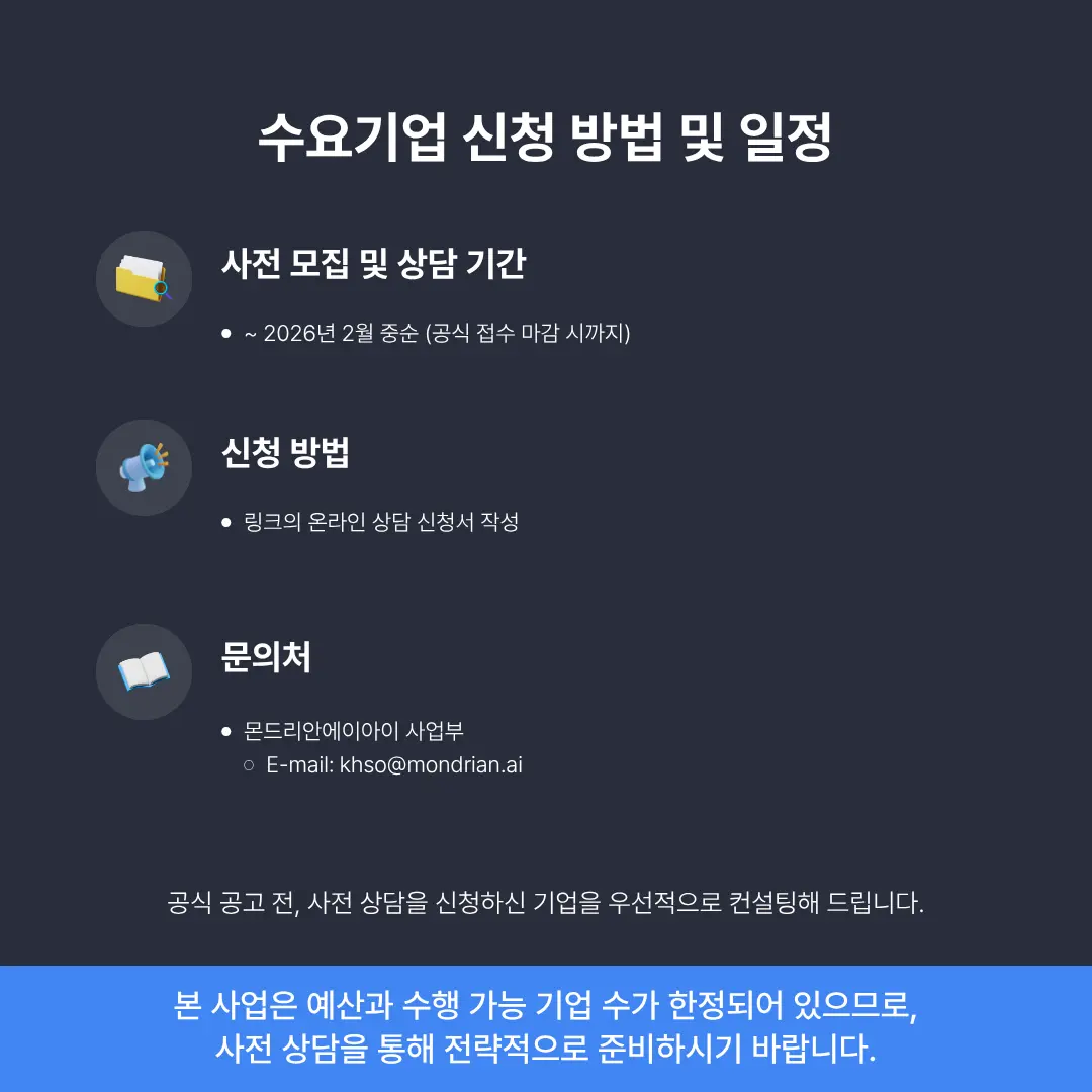 본 사업은 예산 소진 및 수행 가능 기업 수(TO)가 한정되어 있습니다. 공식 공고 전, 사전 상담을 통해 전략적으로 준비하시기 바랍니다.