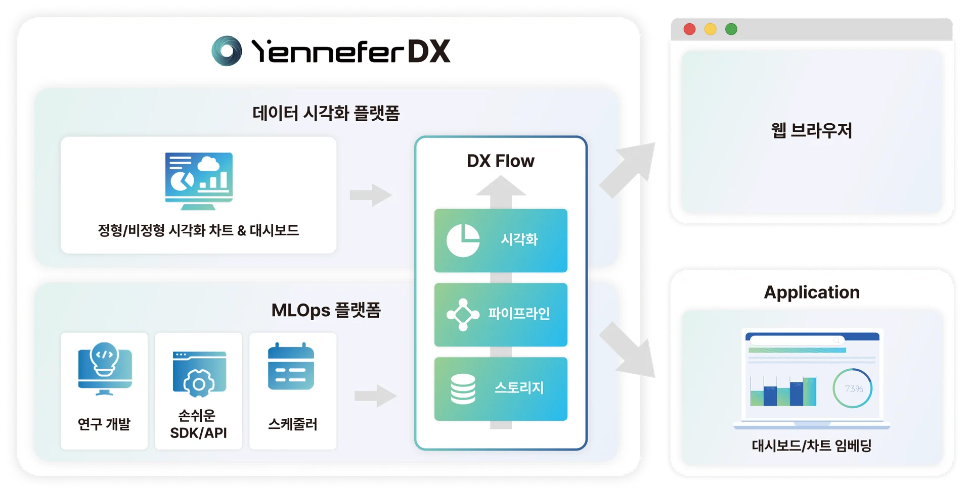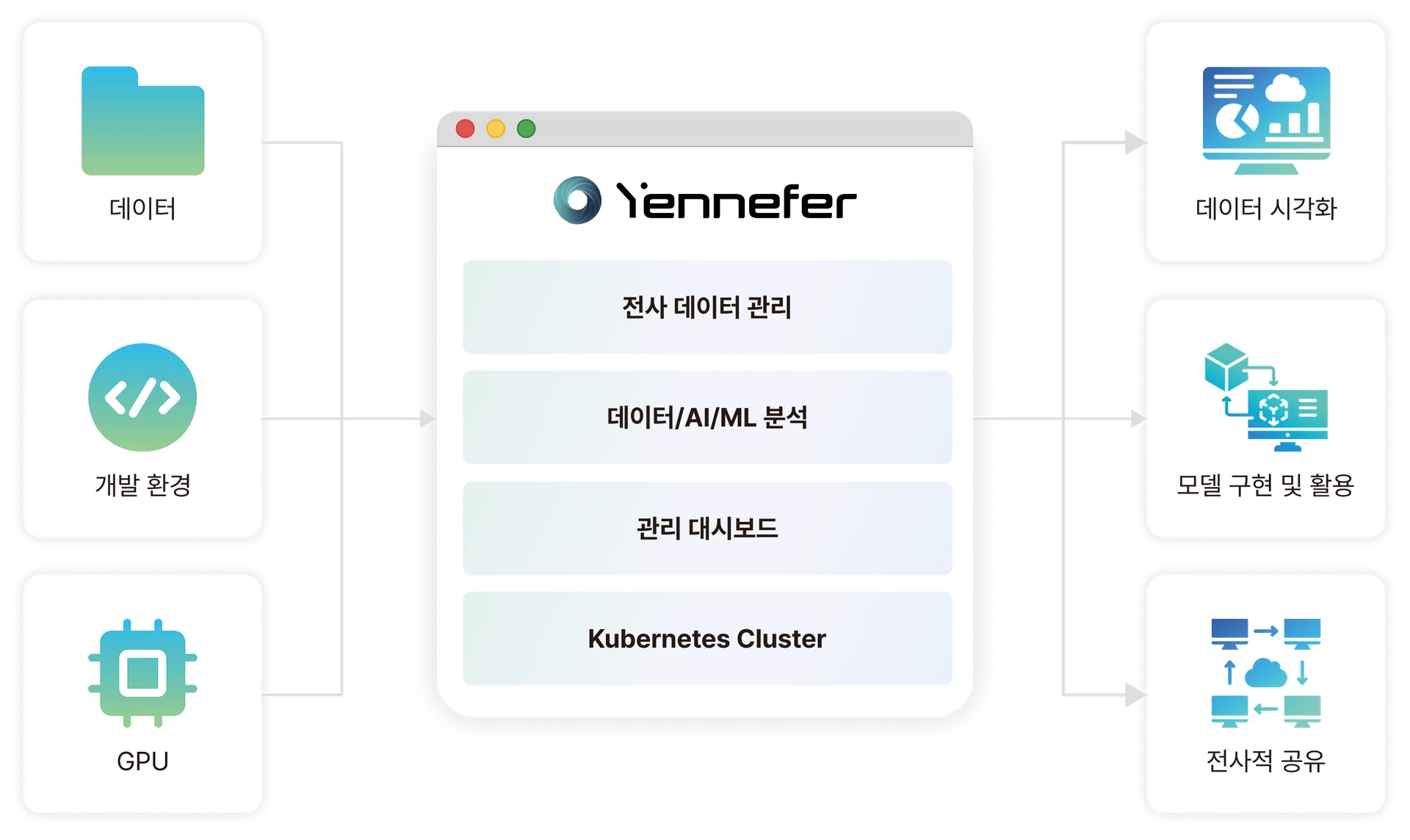 Yennefer DX는 데이터 기반 디지털 전환 플랫폼으로 데이터 파이프라인, 실시간 대시보드, 업무 자동화 기능을 제공합니다. 운영 데이터를 수집해 AI 모델과 연결하고, 현업 프로세스를 자동화해 전체 흐름을 설계할 수 있습니다.