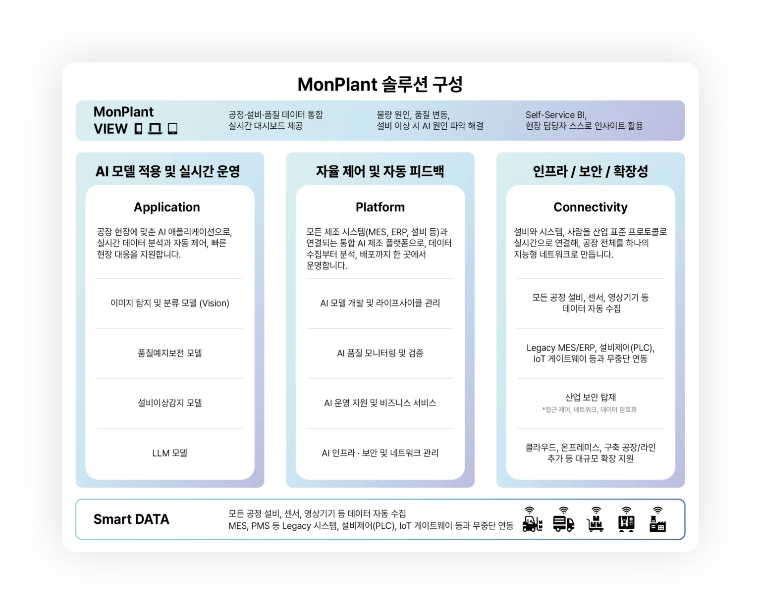 MonPlant는 제조와 산업에 특화된 AI 플랫폼으로, Edge-Core-Cloud 구조를 제공합니다.