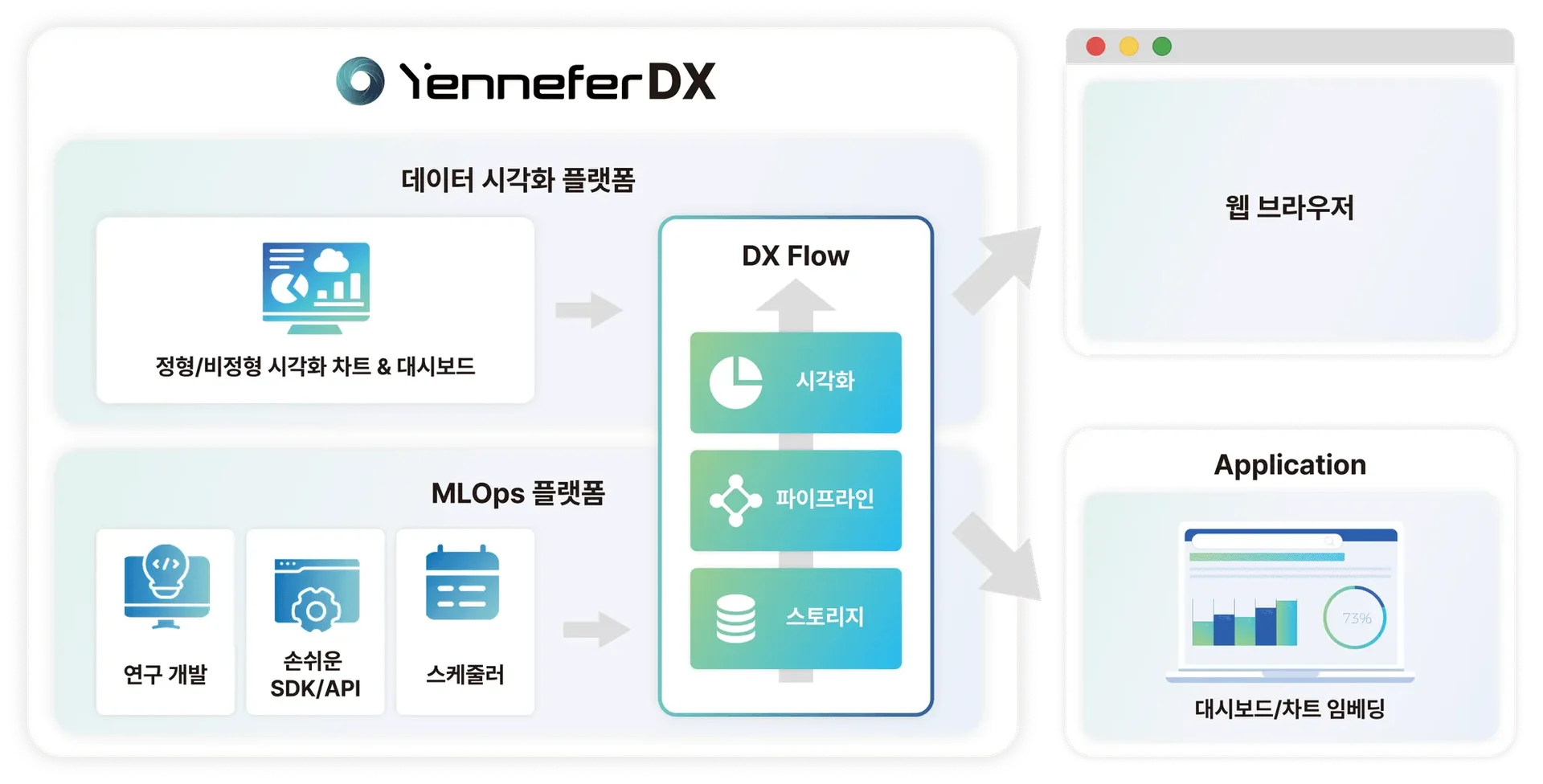 예니퍼 DX는 제조업의 실시간 공정 최적화, 공공기관의 과학적 정책 의사결정, 서비스·금융업의 고객 중심 비즈니스 전환을 지원합니다.