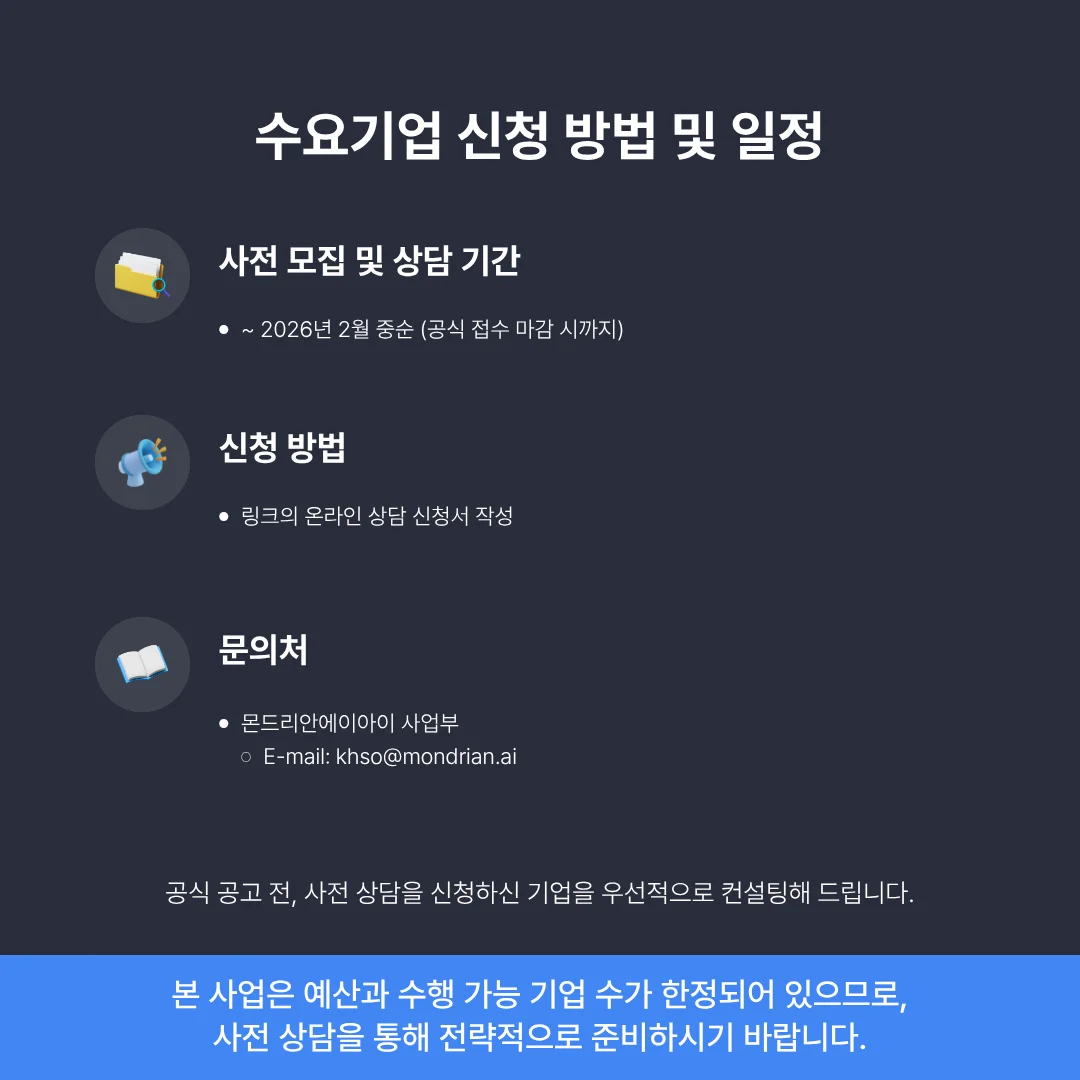 본 사업은 예산 소진 및 수행 가능 기업 수(TO)가 한정되어 있습니다. 공식 공고 전, 사전 상담을 통해 전략적으로 준비하시기 바랍니다.