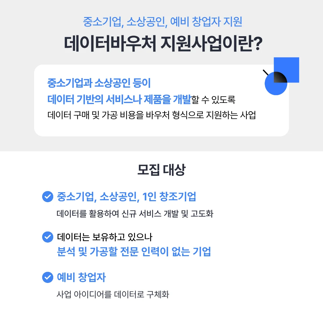 데이터 기반의 비즈니스 혁신 및 서비스 개발이 필요한 기업에게 데이터 구매 및 가공 서비스를 바우처 형식으로 지원하는 정부 주도 사업입니다.