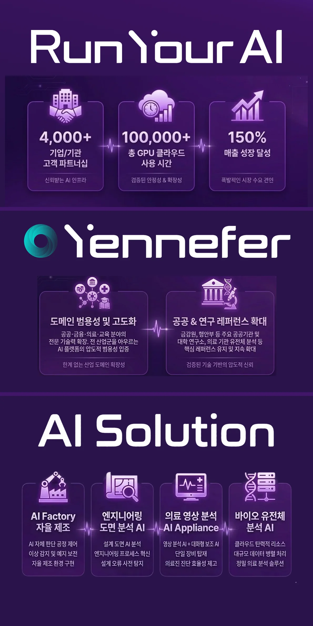 2026 비전: '예니퍼 SaaS'화를 통해 중소규모 B2B 시장과 개인용 B2C 시장까지 영역을 넓힙니다. 또한, 의료·바이오 분야의 암 정복 실증 연구 등 고난도 과제에서 확보한 데이터를 바탕으로 특정 도메인에 최적화된 '버티컬 AI 플랫폼'으로서의 입지를 공고히 하겠습니다.